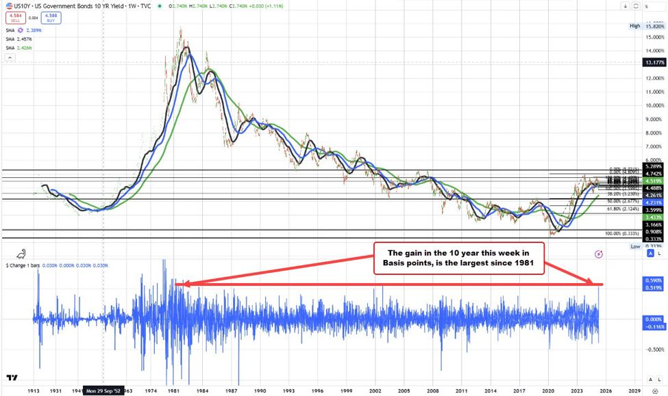 The USD 10-year yield has moved higher with the yield now up 15 basis points at 4.541%. For the week, the yield is up 53 basis points on the week alone. That is the largest 1 week gain since the 1980s (The lower scale on the chart above is the basis point change for the […]