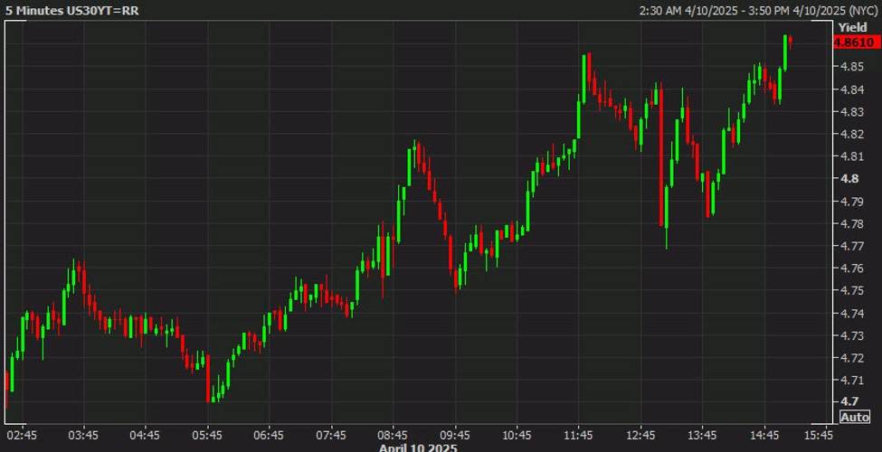 Yesterday was seen as something of a crisis averted for the bond market but the vigilantes are back today. Even a strong 30-year auction with a 2.6 bps stop through was able to only briefly halt the selling. Yields are now at the highs of the day up 6.9 bps to 4.86%. US 30 year […]