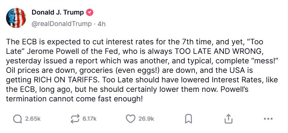 Earlier Pres. Trump railed on Fed Chair Powell (aka Too Late Powell) on Truth Social saying Megan Messerly’s X post reports that Treasury Secretary Bessent has been warning privately that removing Fed Chair Jerome Powell could cause market instability. Trump is reportedly aware of this, so even though he’s upset with Powell again, Powell’s job […]