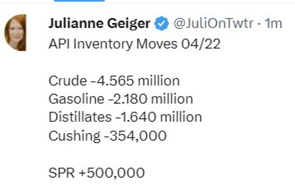 Via oilprice.com: — Expectations I had seen centred on: Headline crude -0.8mn barrels Distillates 0.0mn bbls Gasoline -1.4 mn This data point is from a privately-conducted survey by the American Petroleum Institute (API). It’s a survey of oil storage facilities and companies The official report is due Wednesday morning US time. The two reports are […]