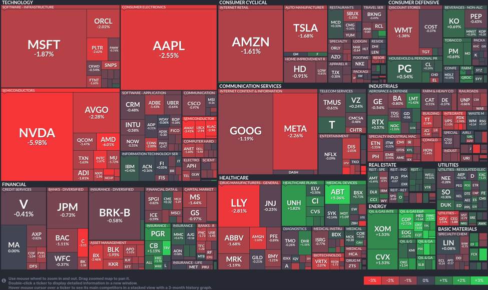 Stock heatmap by FinViz.com Wed, 16 Apr 2025 14:46:07 GMT Sector Overview Today’s stock market heatmap reveals a stark divergence in sector performances. The technology sector is awash in red, with significant declines, while energy and certain areas of healthcare show resilience. 📉 Technology & Semiconductors: Key players like Nvidia (NVDA) plummeted 5.98%, leading a […]
