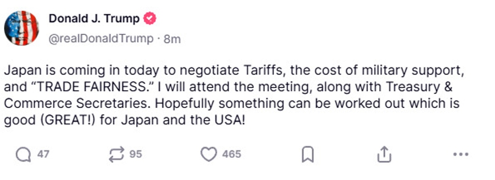 Japan is coming in today to negotiate tariffs, the cost of military support and “trade fairness”. I will attend the meeting, along with Treasury and Commerce Secretaries. Hopefully something can be worked out which is good (GREAT!) for Japan and the USA. Trump is up and running and providing updates on his schedule. Watch out […]
