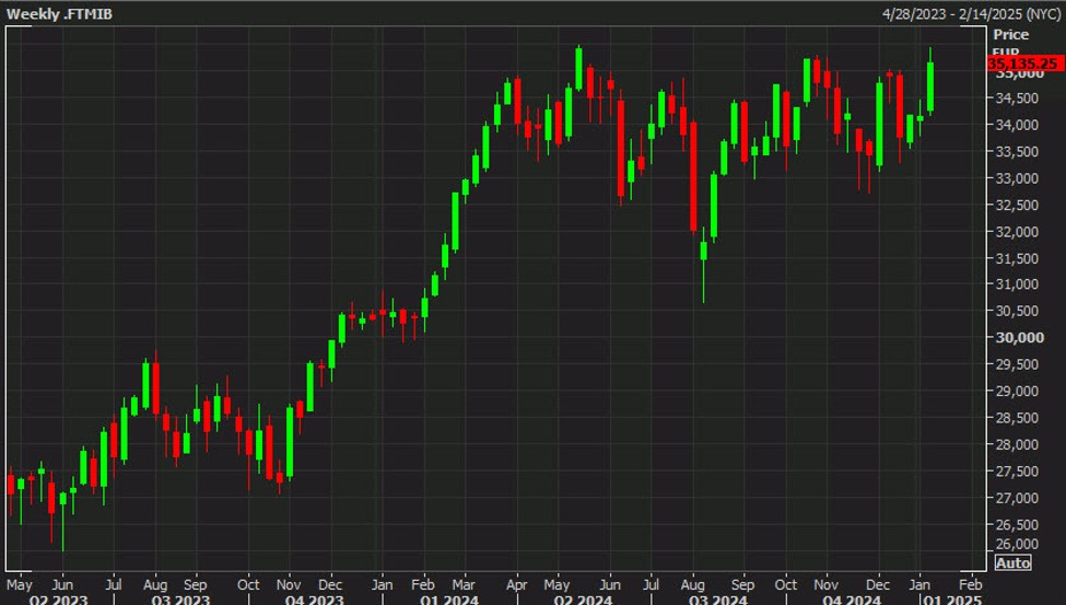 Closing changes for the main European equity markets: Stoxx 600 -0.8% German DAX -0.5% France CAC -0.9% UK FTSE 100 -0.8% Spain IBEX -1.5% Italy’s FTSE MIB -0.5% On the week: Stoxx 600 +0.7% German DAX +1.6% France CAC +2.0% UK FTSE 100 +0.3% Spain IBEX +0.6% Italy’s FTSE MIB +3.0% The Italy MIB is […]