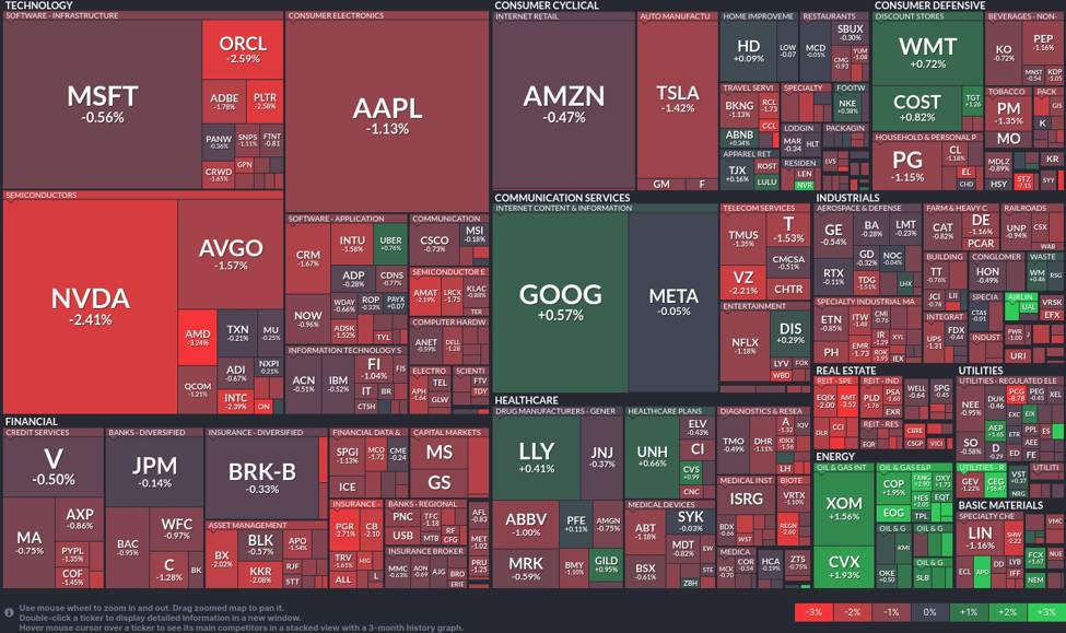 Stock heatmap by FinViz.com Fri, 10 Jan 2025 14:46:14 GMT Energy stocks rally: Tech and semiconductors face pressure The stock market today exhibits a mixed landscape as a resurgence in energy stocks is contrasted sharply by declines in the technology sector, particularly within semiconductors. Investors and traders at ForexLive should note these sector dynamics when […]