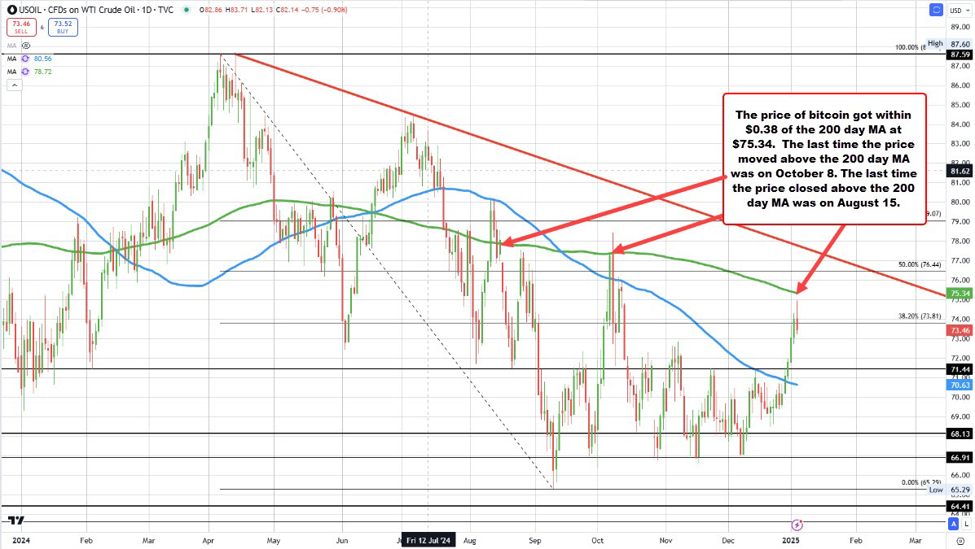 Crude oil futures are settling at $73.56 which is down -$0.40 or -0.54%. The high price today reached $74.96. That high was within shouting distance of the falling 200-day moving average is $75.34 ($0.38). The price has not traded above the 200-day average since October 8 (the break above that MA failed on that day). […]