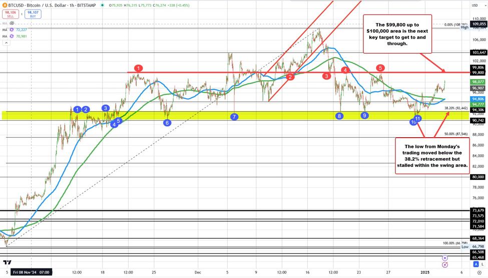 The price of bitcoin is trading to a new session high of $98,374. The current price is trading at $98,010. The run to the upside has taken the price closer to a swing area near $99,800. Just above that is a natural resistance at $100,000. A move above that area would give the buyers more […]