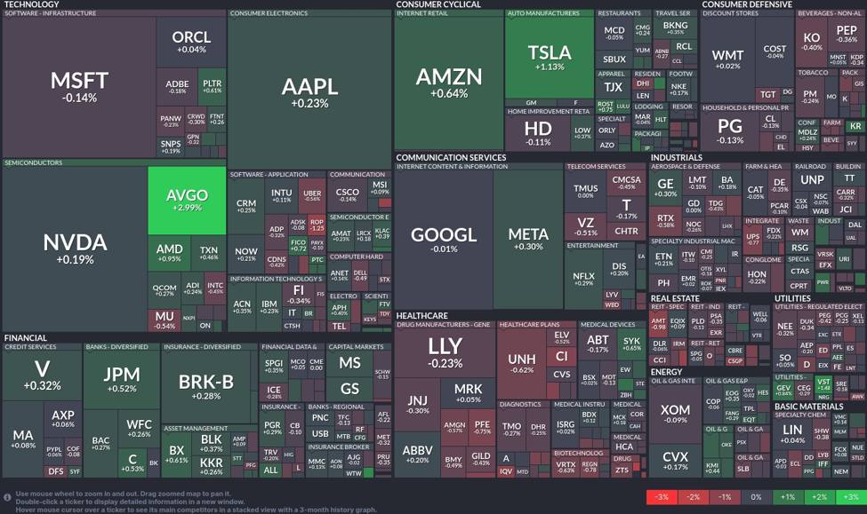 Stock heatmap by FinViz.com Tue, 24 Dec 2024 14:46:15 GMT 📈 Semiconductor Surge: Avago Shines Bright The semiconductor sector is experiencing a strong upswing today, with Avago (AVGO) soaring by 2.99%. This boost contributes to a positive outlook within the sector, as other major players like Nvidia (NVDA) and AMD (AMD) show modest gains of […]